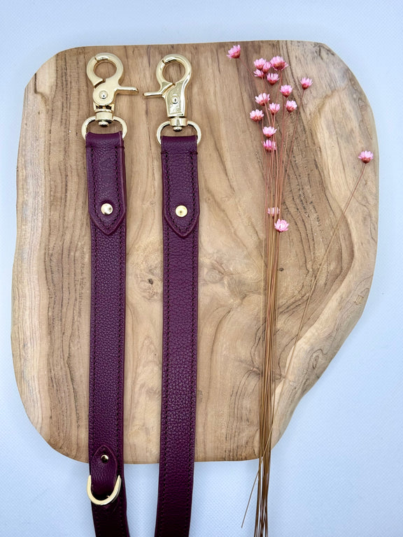 - La doublure des poignées : il s'agit du cuir présent à l'intérieur des poignées. Il existe plusieurs possibilités : du cuir rose gold (CHAMPAGNE), argenté (SILVER), doré (GOLD), bronze (BRONZE) ou ton sur ton (même coloris que le corps de la laisse).